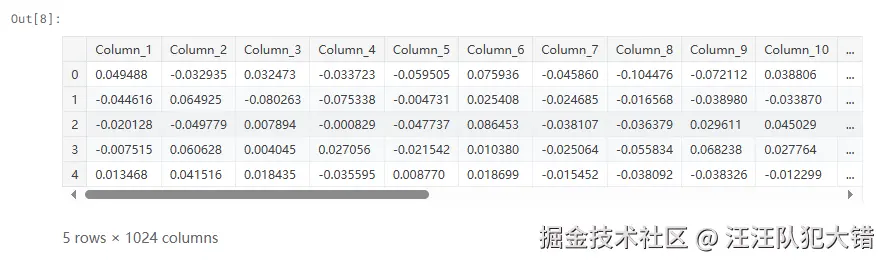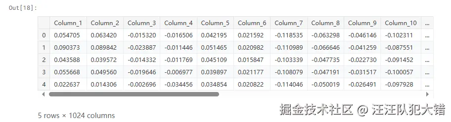 train_df数据帧包含嵌入,由1024列和142246项组成。我们可以用下面的代码打印出数据集的前5个元素,得到所有1024维的数据(由于列的长度太长,结果将被截断):