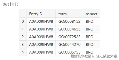 看一下train_terms的第一个条目。tsv,我们可以看到它包含蛋白质id(A0A009IHW8), GO术语(GO:0008152)和它的aspect(BPO)。