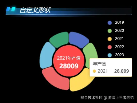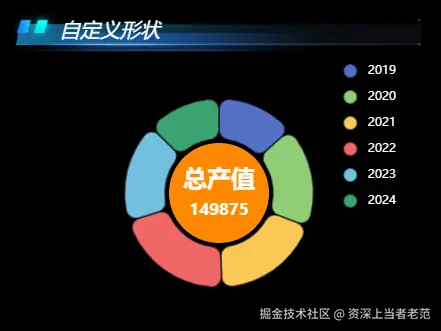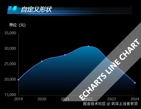 注意,这里的 graphic 自定义图像和上一篇中的 series-custom 不一样,series-custom是根据数据项来绘制图像的,而这里要介绍的 graphic 则是原生图形元素组件,可以绘制水印、X、Y 轴坐标、饼图中在圆心位置绘制特别的图像等等这些不依赖 data 绘制的图像。如下图:
