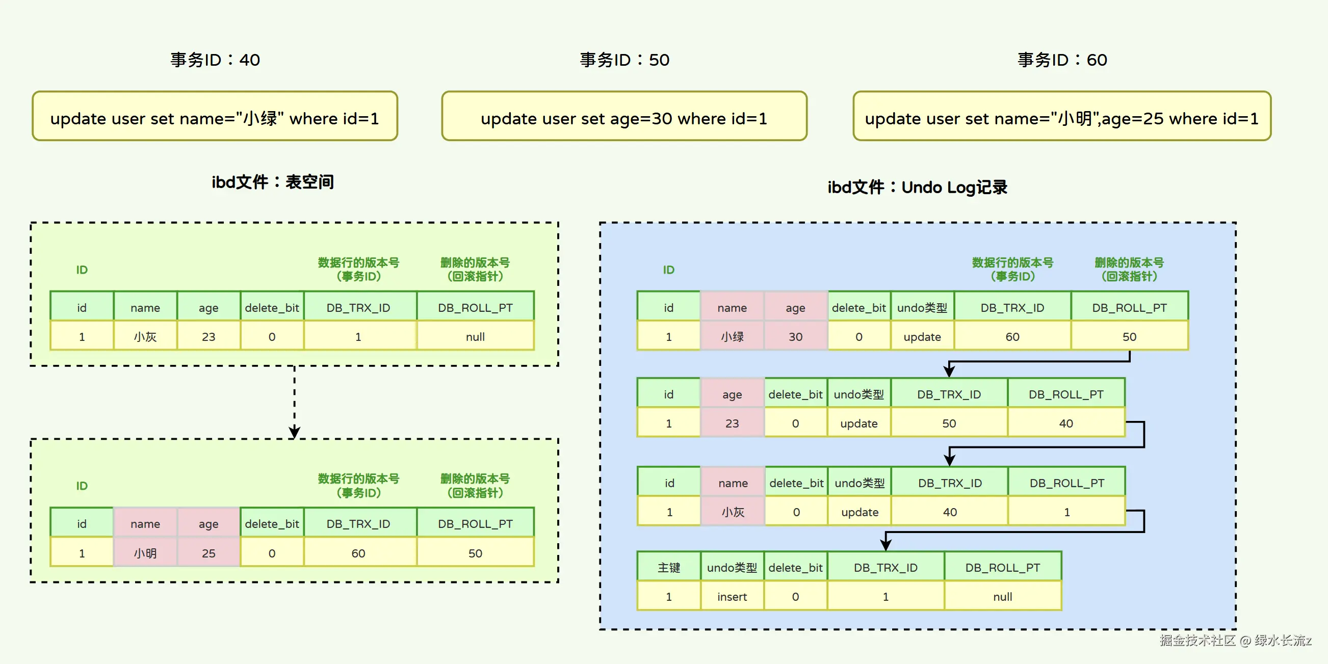 当同一条数据被修改多次,那么Undo Log将通过数据的事务ID和回滚指针能够形成一个非常好的修改链路: