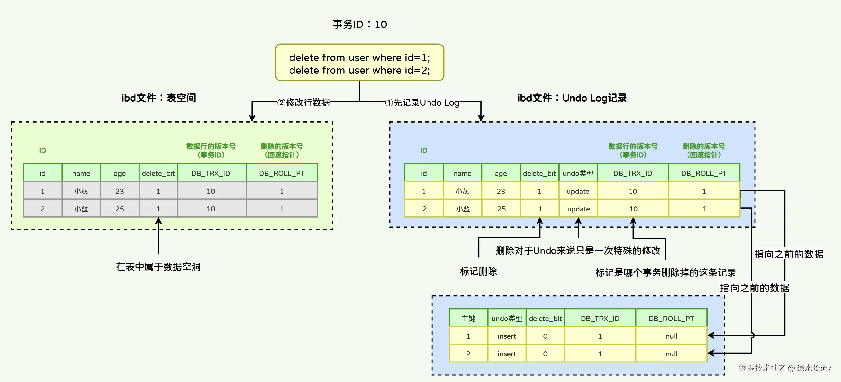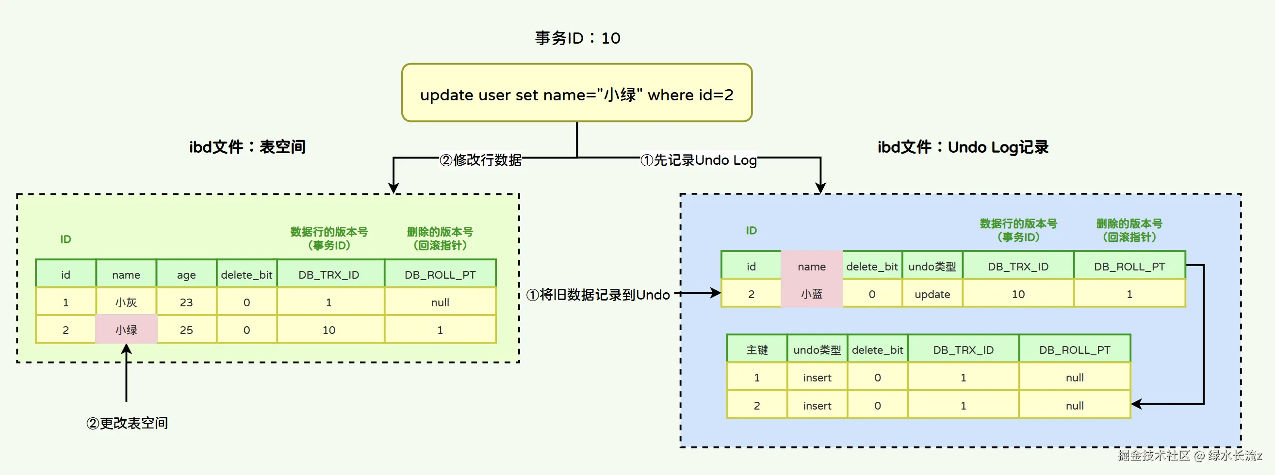 - DB_ROLL_PTR:删除行版本号,也叫回滚指针。指向Undo Log中这条记录的上一个版本,删除记录,记录当前事务ID。(记录这条数据是哪个事务删除的)