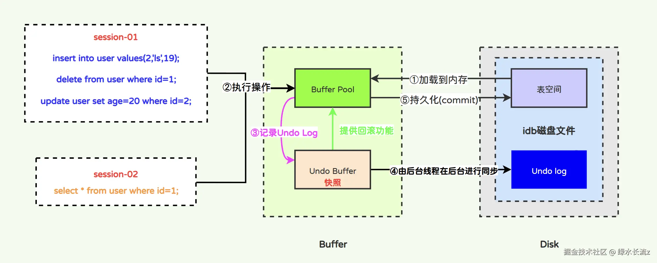 首先在操作表时,会将表数据从磁盘(.idb)加载到内存中(Buffer),对表的update/delete等操作InnoDB都会事先将修改前的数据备份到Undo Buffer中,这样当事务进行回滚时可以根据Undo Buffer中的内容进行事务的回滚操作,除此之外,Undo Buffer提供了数据的快照读取,在事务未提交之前,Undo 日志可以作为并发读写时的读快照,来保证事务的可重复读;