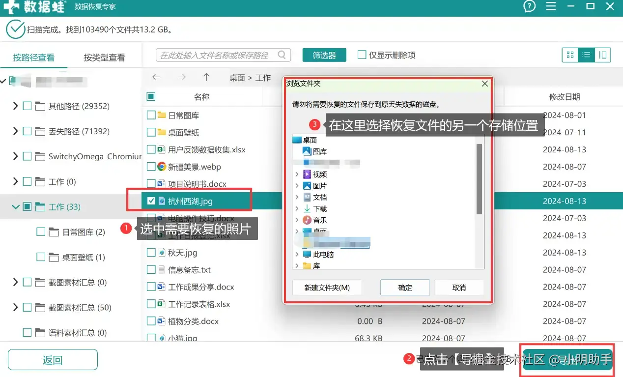 步骤3: 找到需要恢复的文件后,点击选中,再点“导出”。最后在弹窗里,选择恢复照片的存储位置(注意,是需要原位置之外的磁盘位置)。