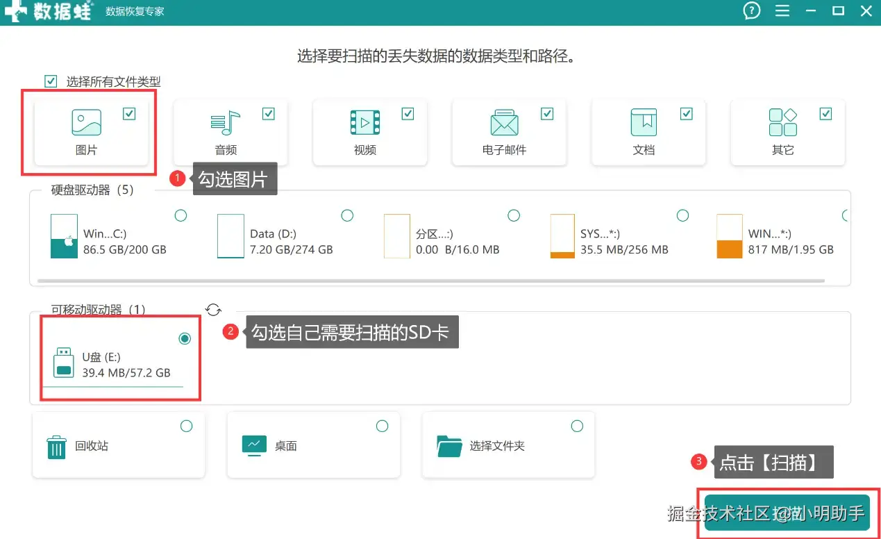 步骤1: 启动数据 蛙恢复专家,在首页选择【图片】,提前将相机SD卡连接好在电脑后,在【可移动驱动器】里选择,完成选择后点【扫描】。