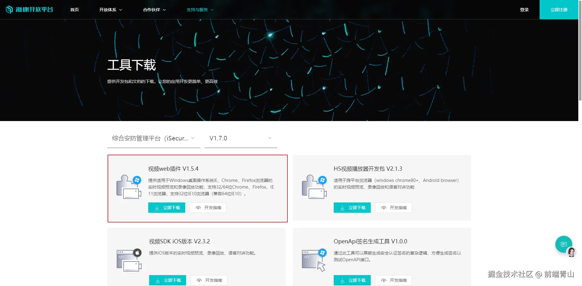 在官网海康开放平台下载视频web插件