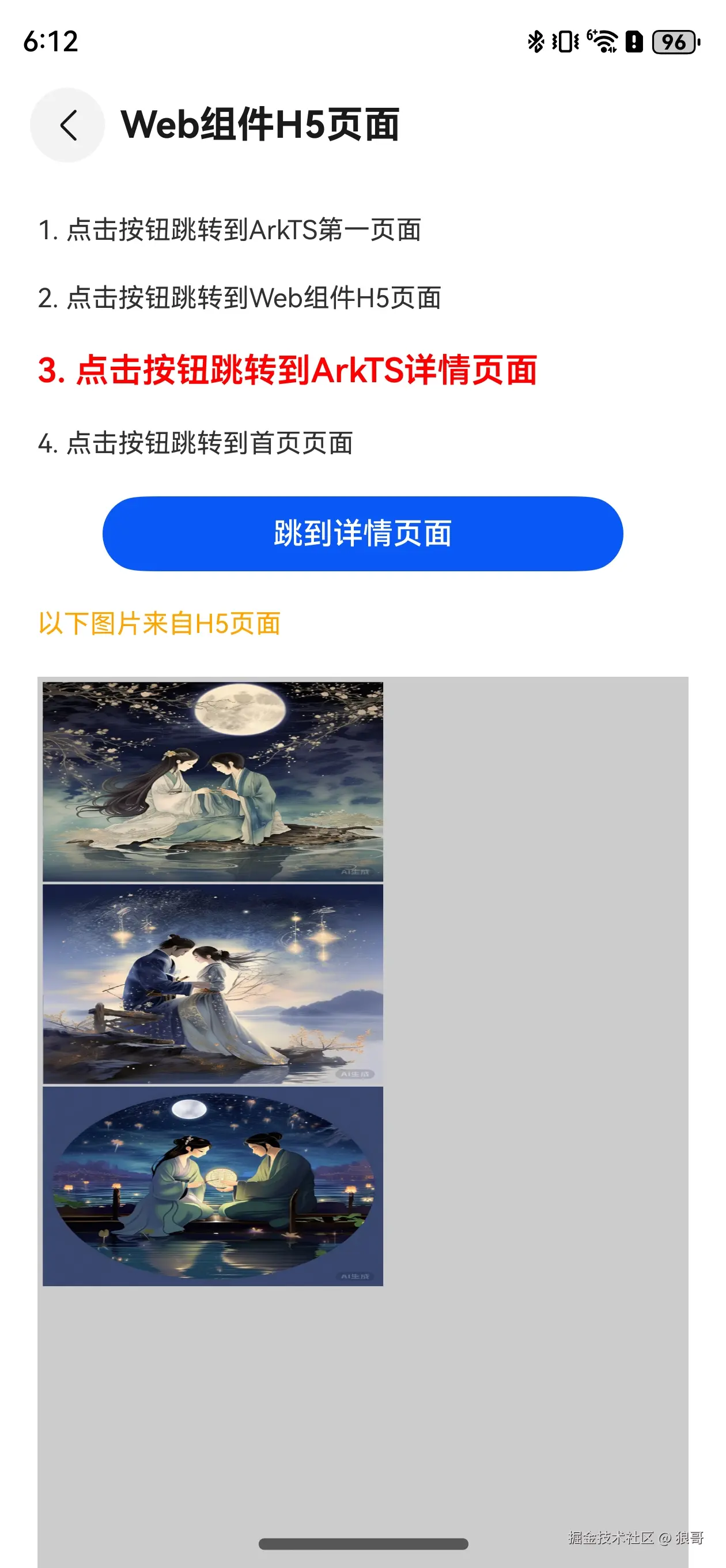 首页显示页面间跳转流程和一个跳转到第一个ArkTS页面按钮,点击首页跳转按钮跳转到普通ArkTS页面,在普通ArkTS页面点击跳转到有Web组件的H5页面,在Web组件H5页面,点击H5页面里的图片,跳转到详情页面,详情页面显示从H5页面传出的参数,并显示传出参数的图片,如果点击Web组件H5页面按钮,跳转到详情页,由于没有点击H5页面,参数为默认图片值。