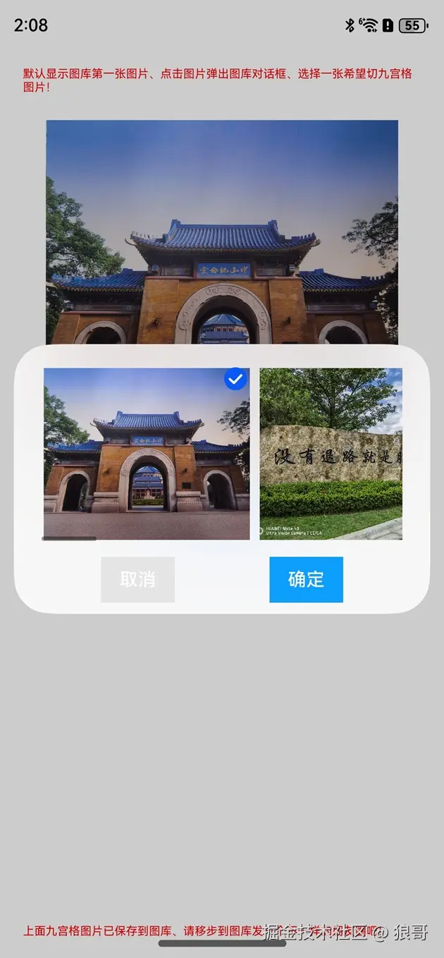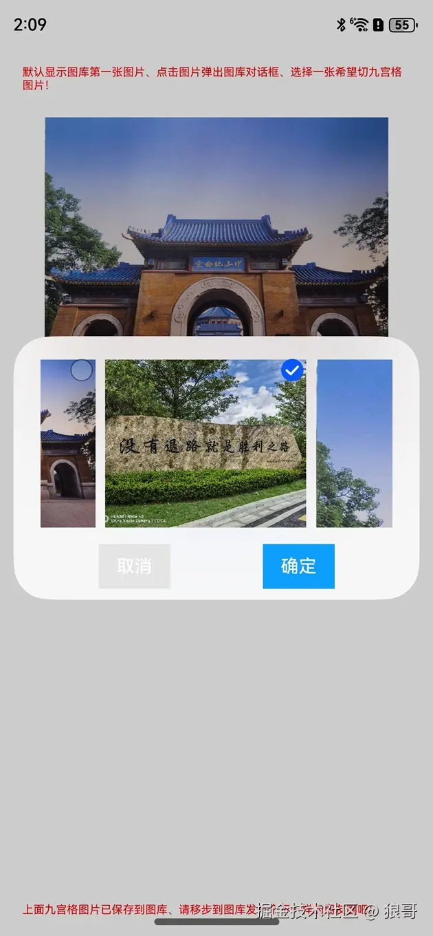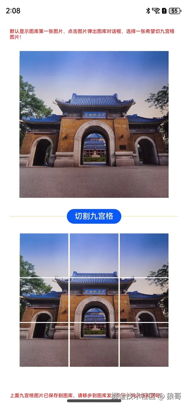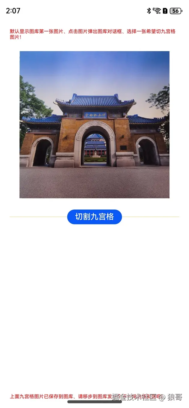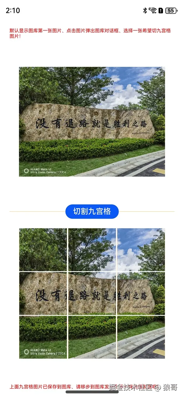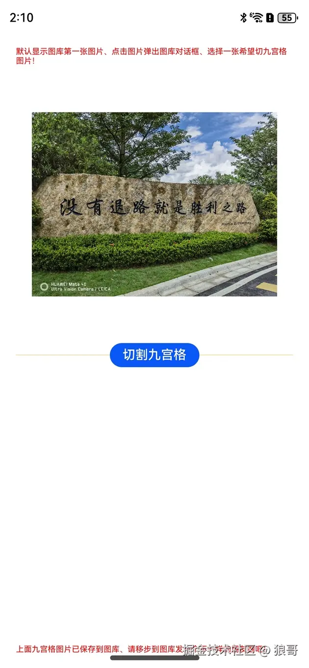 顶部和底部显示红色说明文字,上面默认显示图库第一张图上,点击图片弹出对话框选择图库里的其它图片,下来是个切割九宫格按钮,点击可以把选择的图片切割为九张图片,并自动保存到图库里。