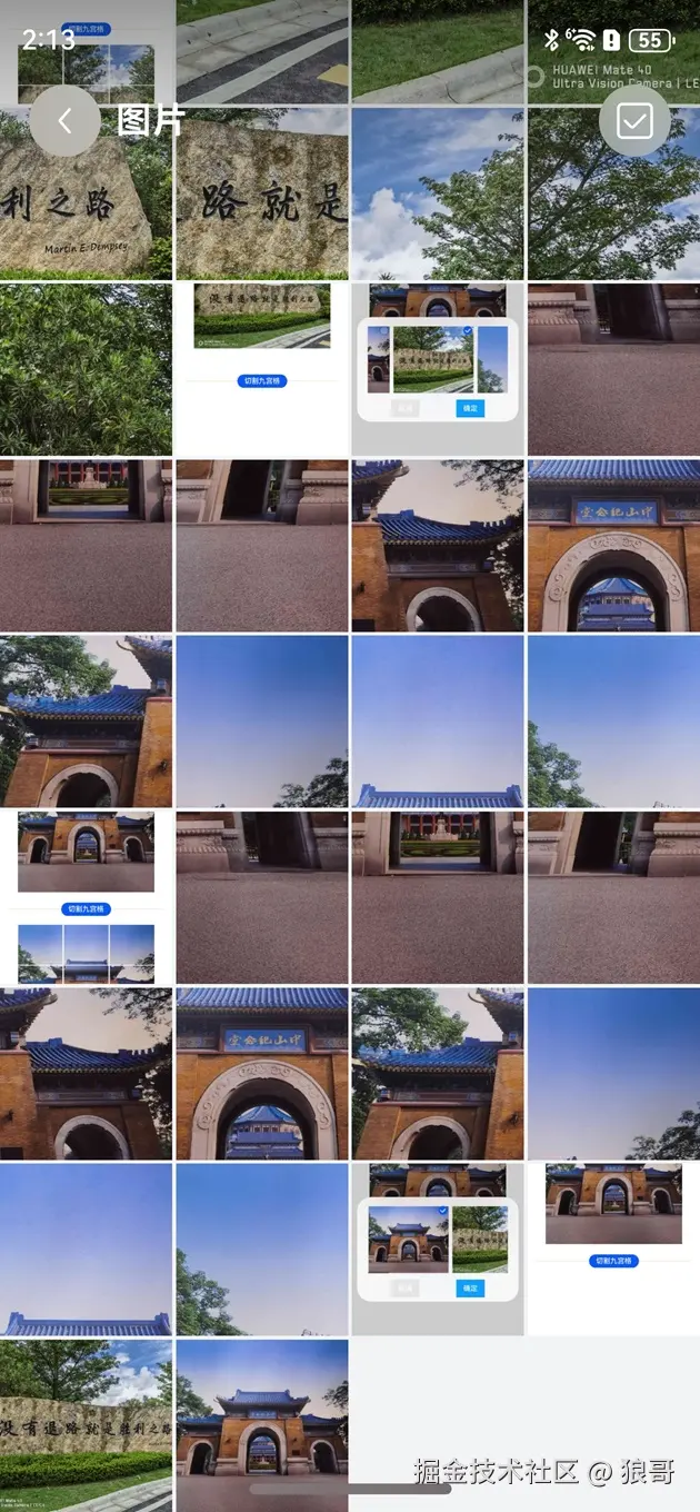 使用createImagePacker创建ImagePacker实例,然后使用fs.open打开文件,调用createImageSource接口创建图片源实例方便操作图片,接下来使用getImageInfo方法获取图片大小便于分割,最后使用createPixelMap方法传入每一份的尺寸参数完成图片裁剪。具体就是根据图片选择对话框,选择的下标,到图库里获取到选择的图片,然后以只读方式打开图片,获取打开图片信息,计算出切图后的宽度和高度,根据参数生成新切图,并缓存到数组里,方便显示切图后的九宫格,最后调用存储函数把切图存储到图库里,方便之后使用,比如发朋友图。