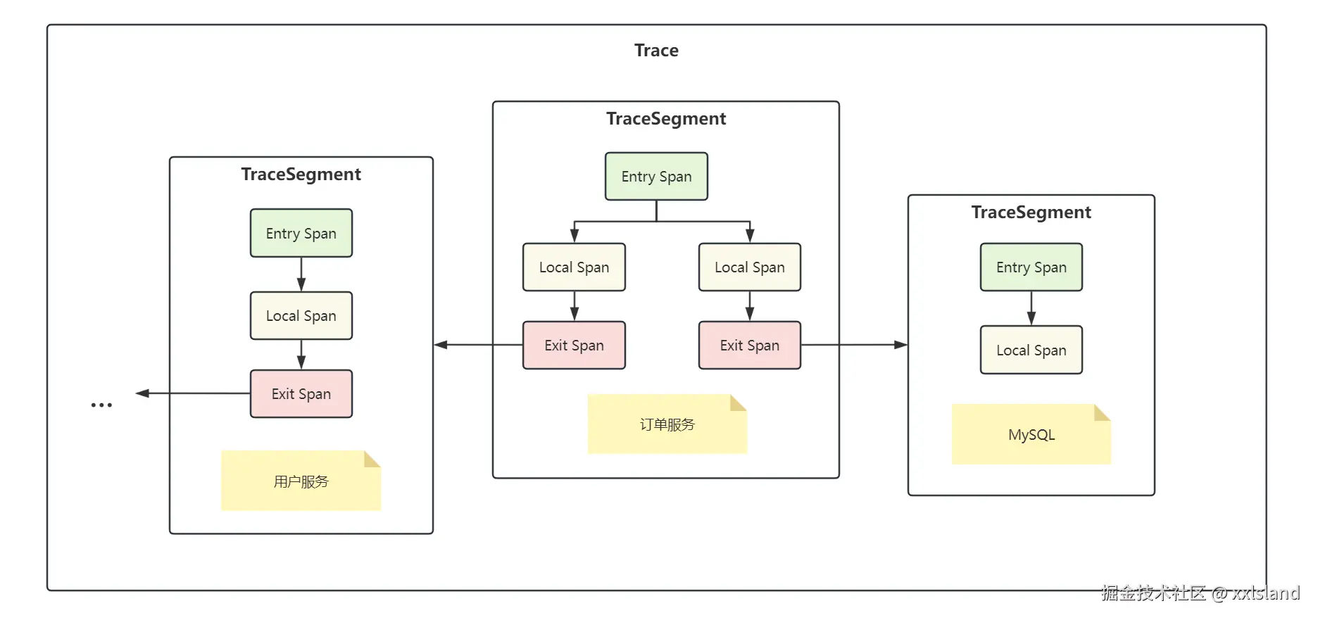 - Exit Span:从本服务调用另一个服务的请求,通常是服务间的远程调用。