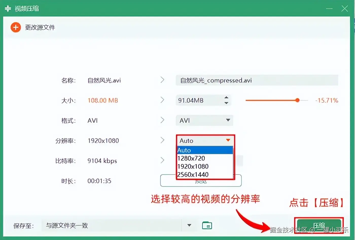 步骤4:点击分辨率选项,选择较高的视频的分辨率,即可输出较高的视频质量,最后点击 【压缩】 即可。