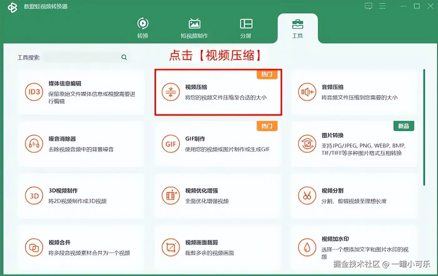步骤1:打开该工具运行,点击 【视频压缩】 工具进入压缩界面。