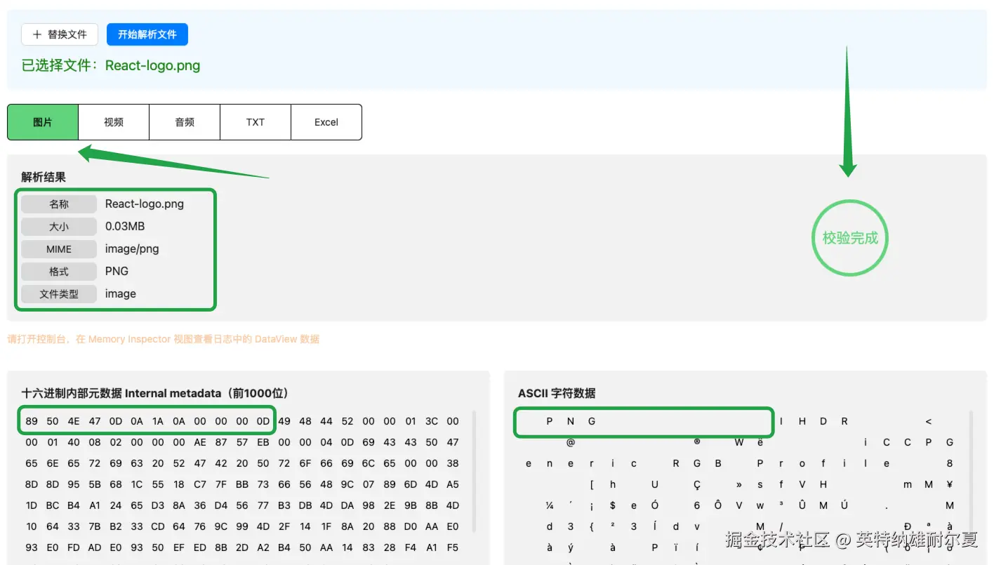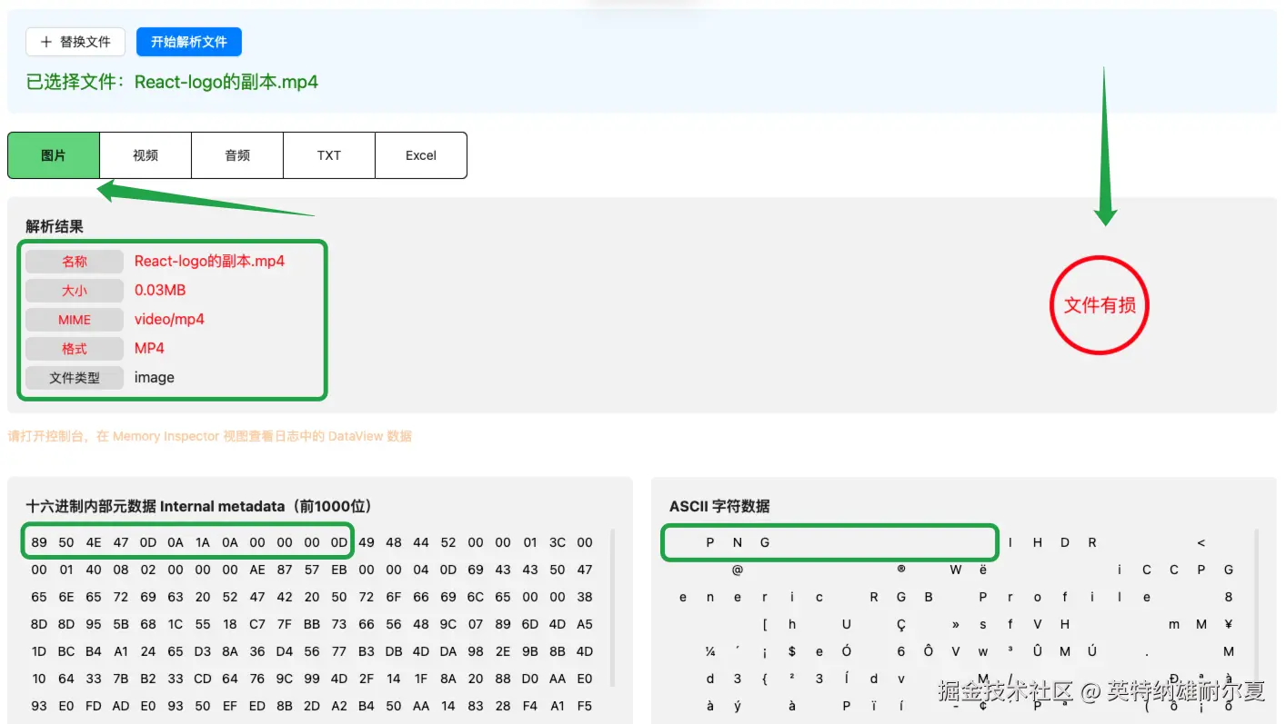 复制react-logo.png文件,并重命名为react-logo的副本.mp4,文件扩展名name和媒体类型mime type改变了。但是文件元数据的魔术数字并没有改变,依旧是png的文件签名,这是由对应文件标准规范制定的语法结构。