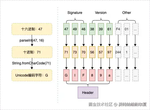 | gif | image/gif | 47 49 46 38 39 61 47 49 46 38 37 61 | 前三个字节称为签名,接下来的三个字节称为版本(GIF89a、GIF87a) | |