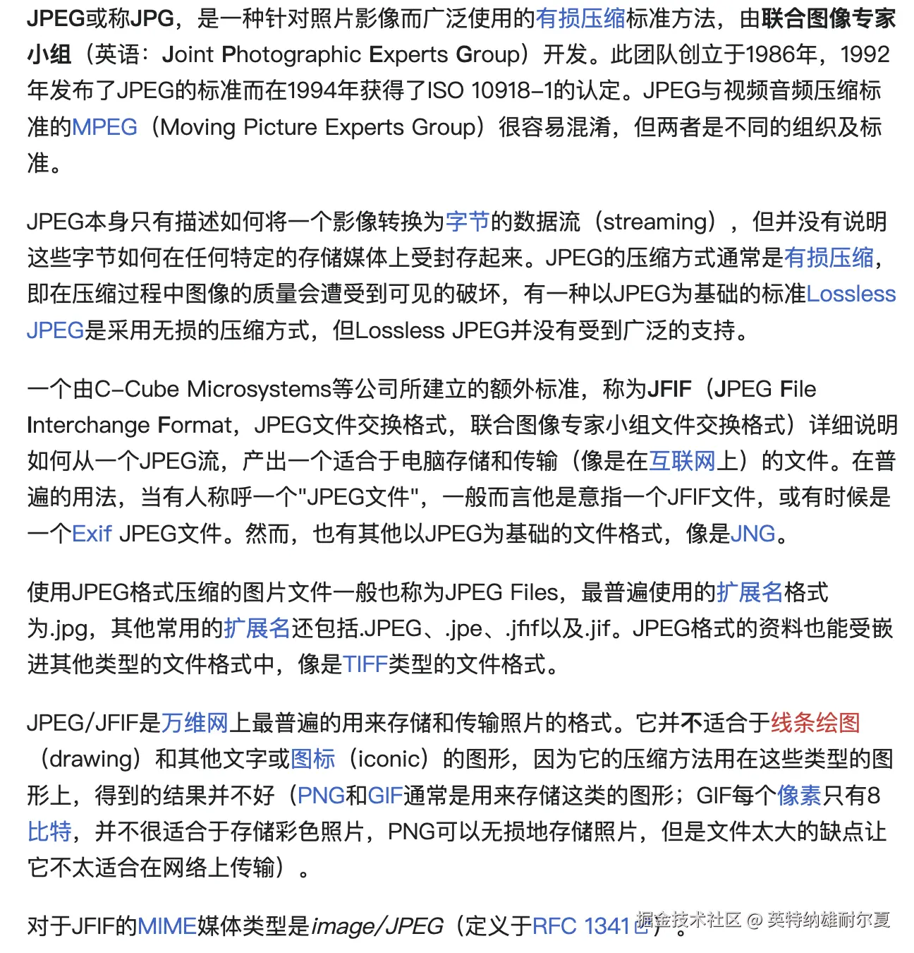 JPEG 文件交换格式是一项图像文件格式标准。JPEG 容器格式的基本规范在 JPEG 标准的附件 B 中定义,称为JPEG 交换格式(JIF)。JFIF 建立在 JIF 的基础上,解决了 JIF 的一些限制,包括不必要的复杂性、组件样本注册、分辨率、宽高比和色彩空间。