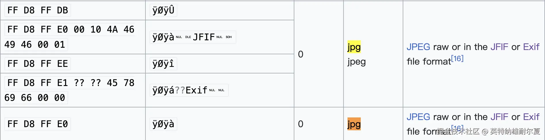 | jpg/jpeg | image/jpeg | FF D8 FF DB FF D8 FF E0 FF D8 FF E1 FF D8 FF EE | 文件格式标准:JFIF、Exif | |