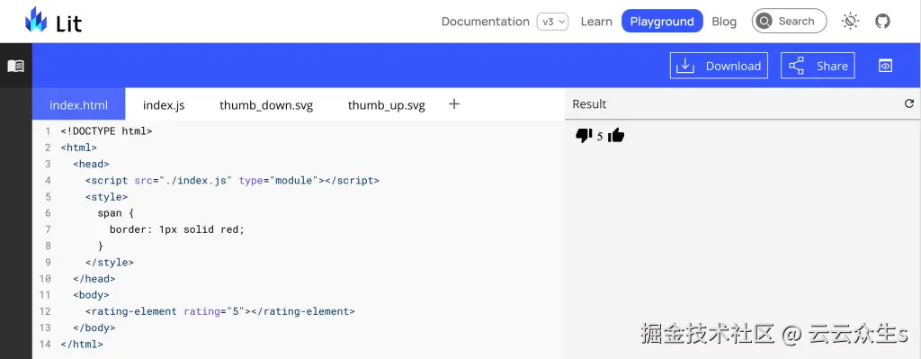 这让我们了解了组件是如何构建的。我们只想挑选出基本的内容,因为这是 Shoelace 构建的基础。我们将查看这里游乐场中的代码。