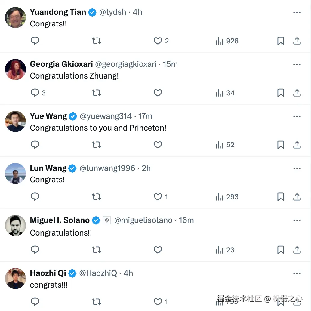 田渊栋等各路大佬第一时间齐刷刷地送上了祝福: