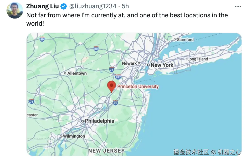 在正式踏入学术界之前,刘壮还会在 Meta AI Fair 继续担任研究科学家。因为普林斯顿大学离纽约不远的,刘壮在官宣新去向后,还晒了张地图:「我离这世界上最棒的地儿不远。」
