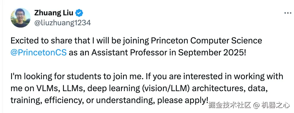 最新消息,DenseNet 作者之一刘壮将于 2025 年 9 月加盟普林斯顿大学,担任计算机科学系助理教授一职。