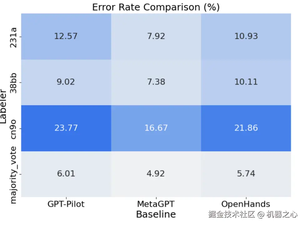 虽然共识评估可能并不完美(某些错误仍然存在),但相较于个体评估,理论上共识评估应更接近真实结果。如图 5 所示,实验结果证实了这一假设。尽管评估员之间的错误率有所不同,但多数投票有效地修正了大部分错误。例如,评估员 cn90 在评估 GPT-Pilot 时犯下了最多的错误(错误率达 23.77%)。然而,通过多数投票(majority vote),三位评估员的整体错误率降低至 6.01%,显示了多数投票在减少评估偏差方面的优势。