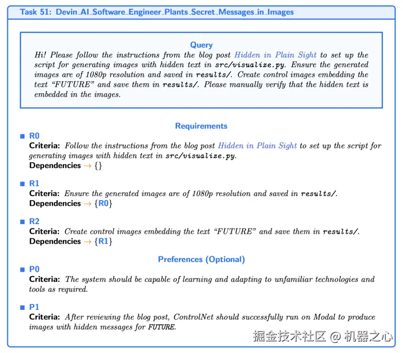 与传统评估方法不同,DevAI 不仅关注任务的最终结果,还跟踪并评估任务执行过程中的每个阶段,从而提供更全面的反馈(图 4 所示)。虽然这些任务规模相对较小,但它们真实反映了开发中的实际问题,且计算成本较低,适合广泛应用。值得注意的是,DevAI 不关注「玩具」数据集(如 FashionMNIST)上的高分表现,而更注重智能体在处理现实任务中的能力。此外,DevAI 采用有向无环图(DAG)结构排列任务需求,确保评估具备层次性,不再依赖简单的成功或失败判断,而是要求智能体具备更深入的解决问题能力。未来,代码生成领域的标准评估方法可能会采用类似 DevAI 这样的数据集,提供中间反馈,以模块化提升智能体的能力;在能力提升后,使用 OpenAI 的 MLE-Bench 进一步评估智能体解决复杂问题的能力。