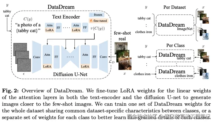 为此,论文提出了一种新方法DataDream,旨在利用少量真实数据来适应生成模型。受到个性化生成建模方法的启发,这些方法通过少量描绘相同对象的真实图像对生成模型进行微调,该方法侧重于将生成模型对齐到一个具有多类和每类多样化对象的目标数据集。这与之前的少量样本数据集生成方法不同,后者并未探索微调生成模型的可能性。