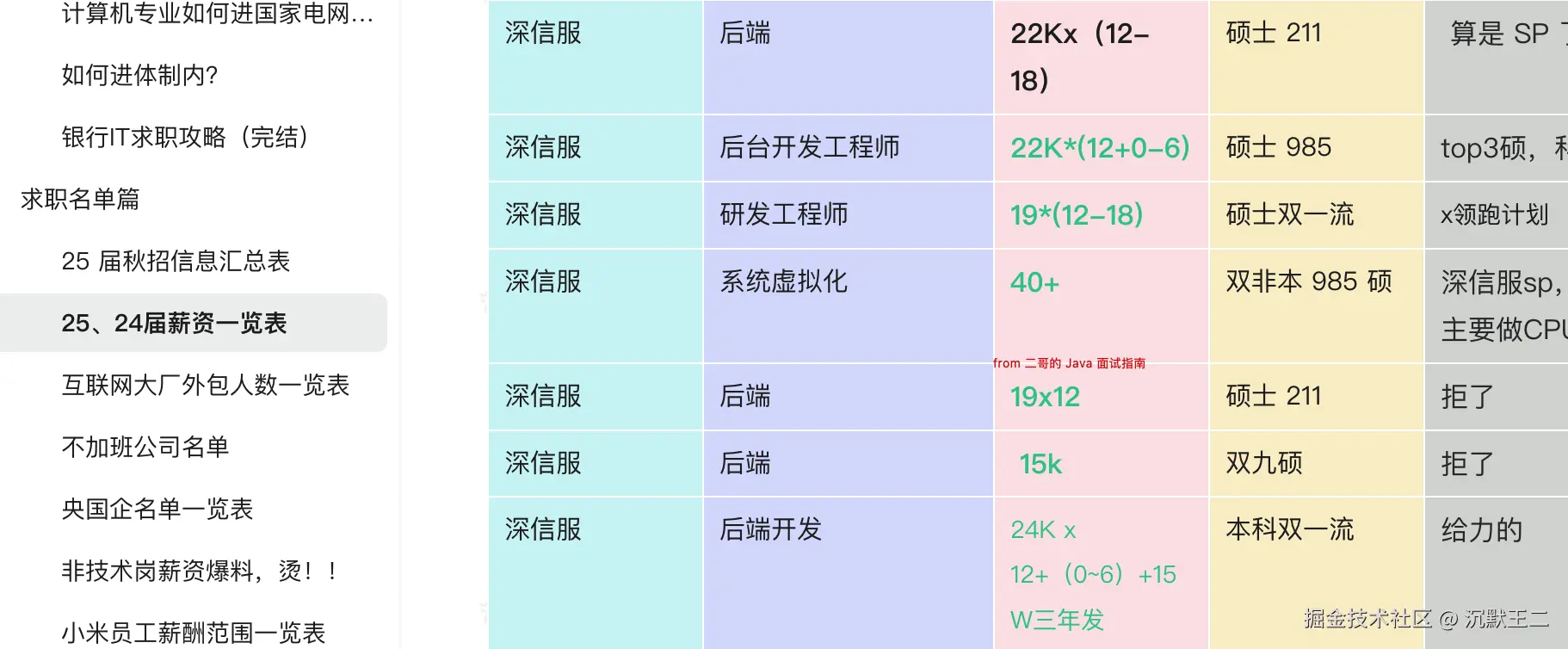 那我简单给大家盘点了一下深信服 25 届已开奖的薪资,已收录在《Java 面试指南》中,里面还有很多其他公司的薪资统计,感兴趣的小伙伴可以直达参考一下。