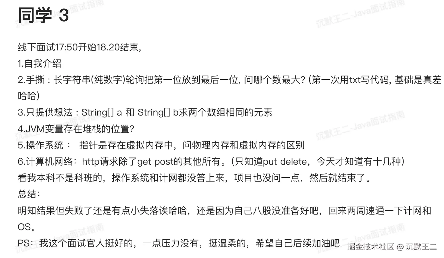 那今天我们以《Java 面试指南》中收录的同学 3 深信服 Java 后端线下一面为例,来看看这 30 分钟内面试官都问了哪些问题,好心中有数。