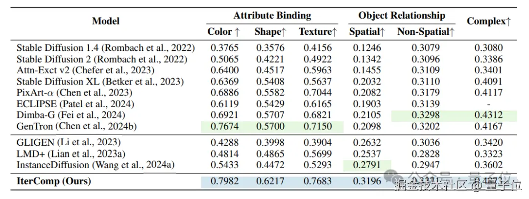从定量结果中可以看出,IterComp 在 T2I-CompBench 上取得了各方面的领先。
