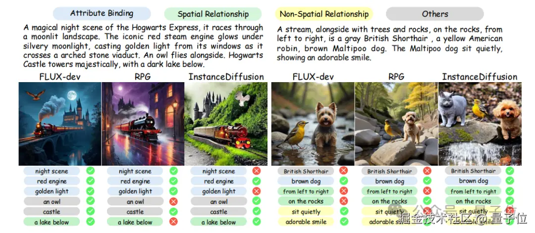 基于文本的生成方法(如 SDXL、SD3、Flux 等),由于其训练数据和框架的优势,在物体与场景的模拟上表现出色,特别在美学质量、属性绑定和非空间关系(non-spatial relationships)方面具有显著优势。
