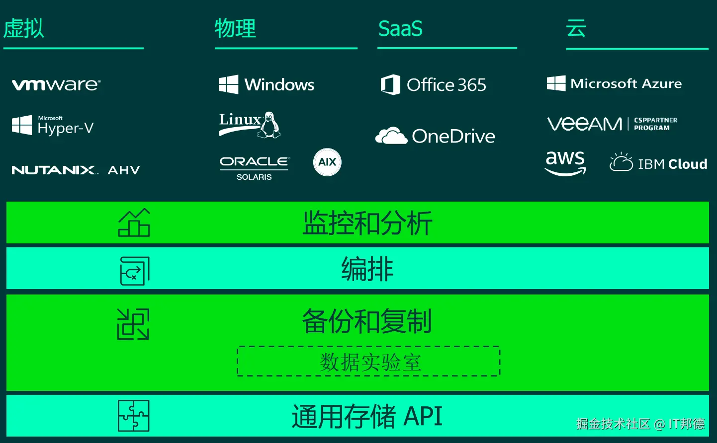 接下来给你介绍这一款备份界的扛把子-Veeam Data Platform,包括UNIX、Windows、Linux等操作系统,Oracle\MySQL\PostgreSQL及几乎所有类型的应用程序和存储设备。