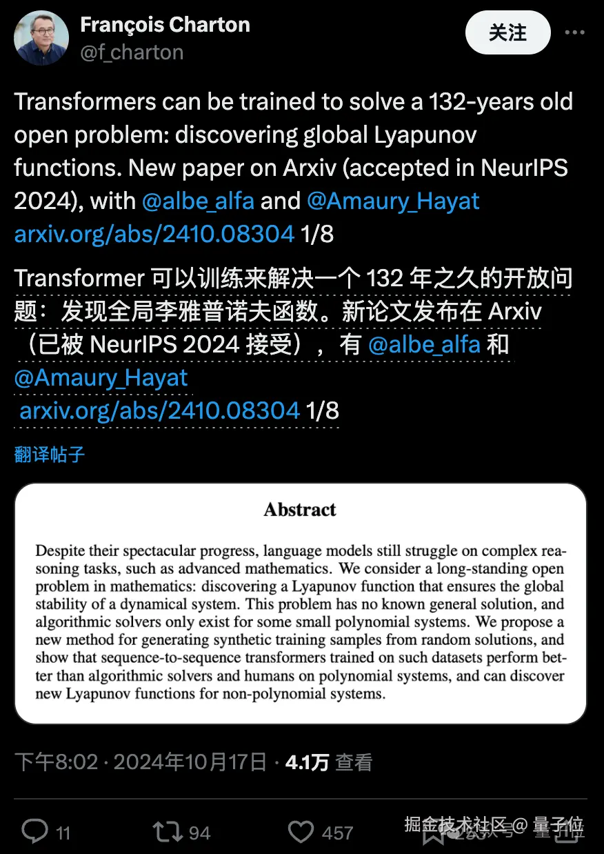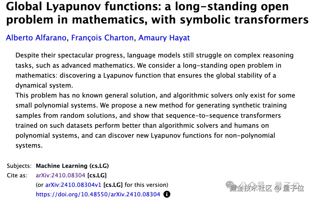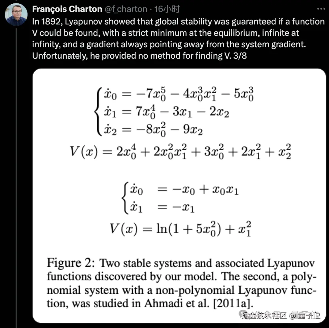作者 Meta 科学家 François Charto 表示,尽管 Symbolic Transformer 像其他 AI 模型一样还是一个黑盒系统,但它给出的李雅普诺夫函数是明确的符号表达式,完全可以经受数学证明的检验。