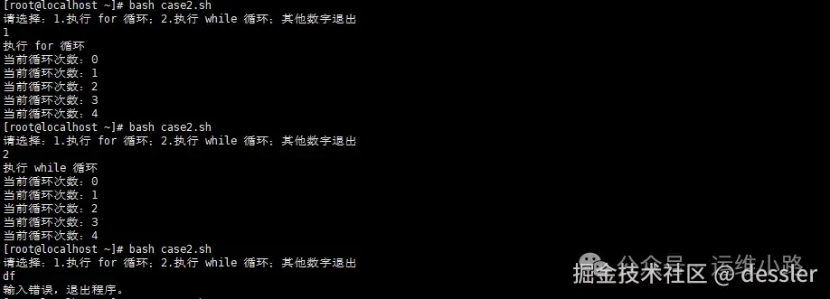 echo "请选择:1.执行 for 循环;2.执行 while 循环;3.执行调用脚本;其他数字退出"