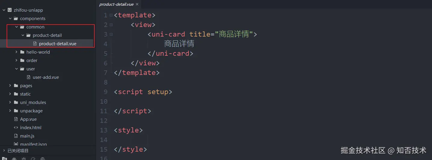 新建 common 文件夹,新建 product-detail 同名的文件夹和 vue 文件。
