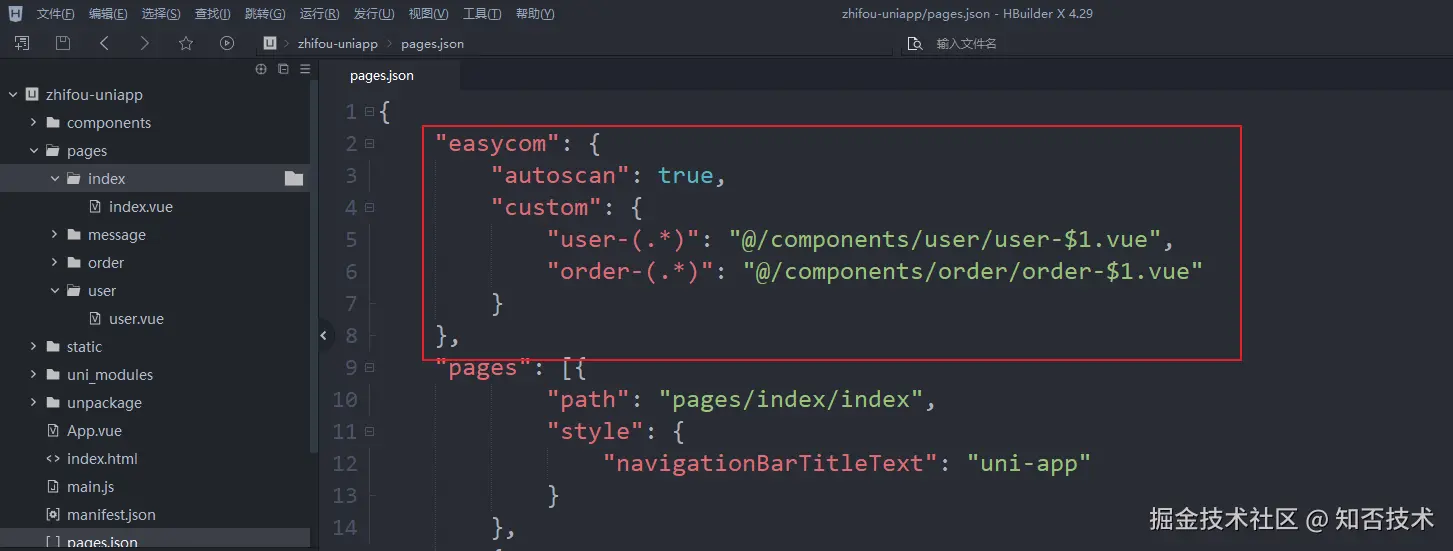 在 pages.json 里面配置 easycom 属性,其中 autoscan 表示自动扫描,custom 表示自定义规则。