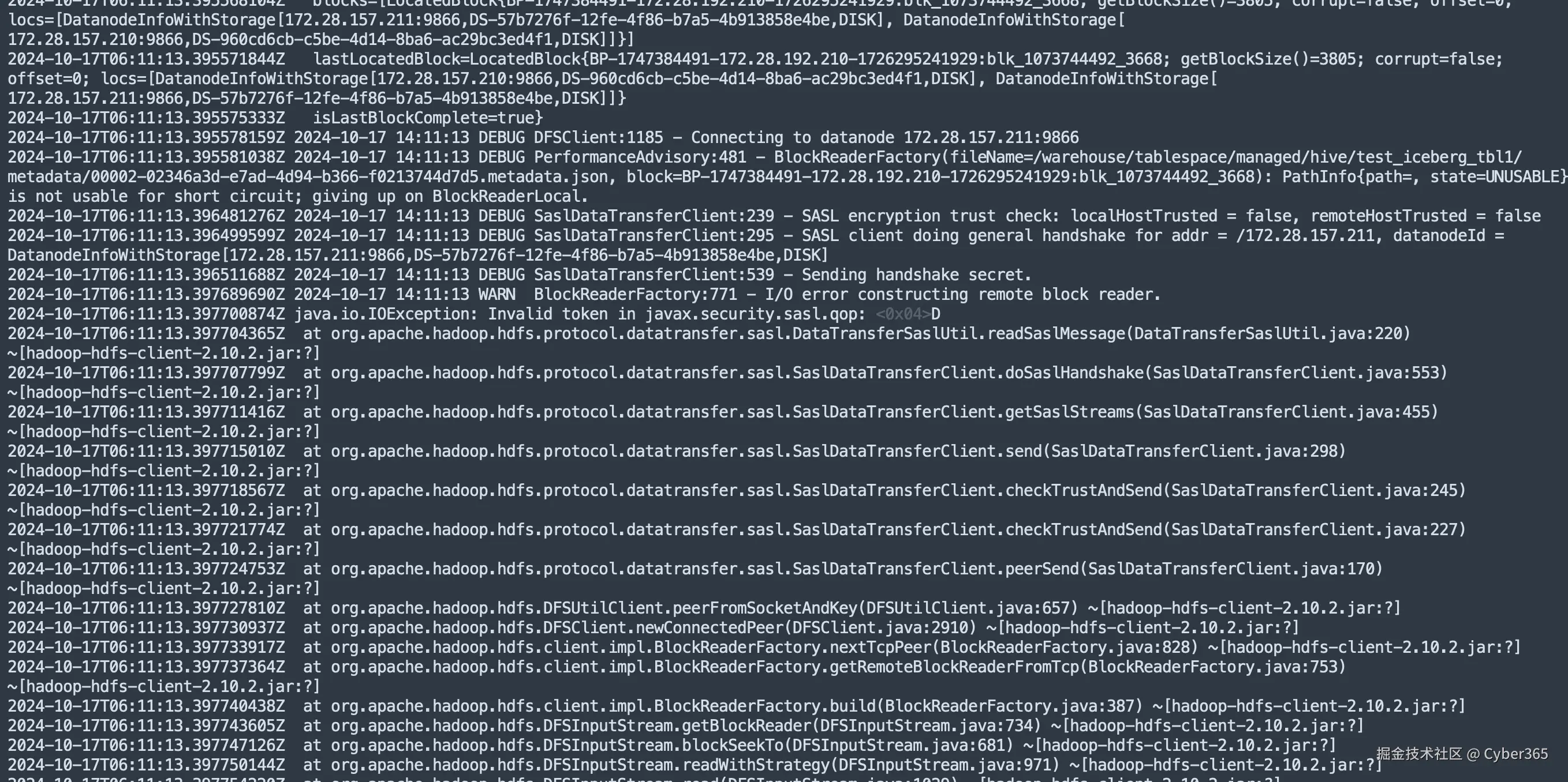 2024-10-17T06:11:13.402764244Z at org.apache.hadoop.hdfs.protocol.datatransfer.sasl.DataTransferSaslUtil.readSaslMessage(DataTransferSaslUtil.java:220) ~[hadoop-hdfs-client-2.10.2.jar:?]