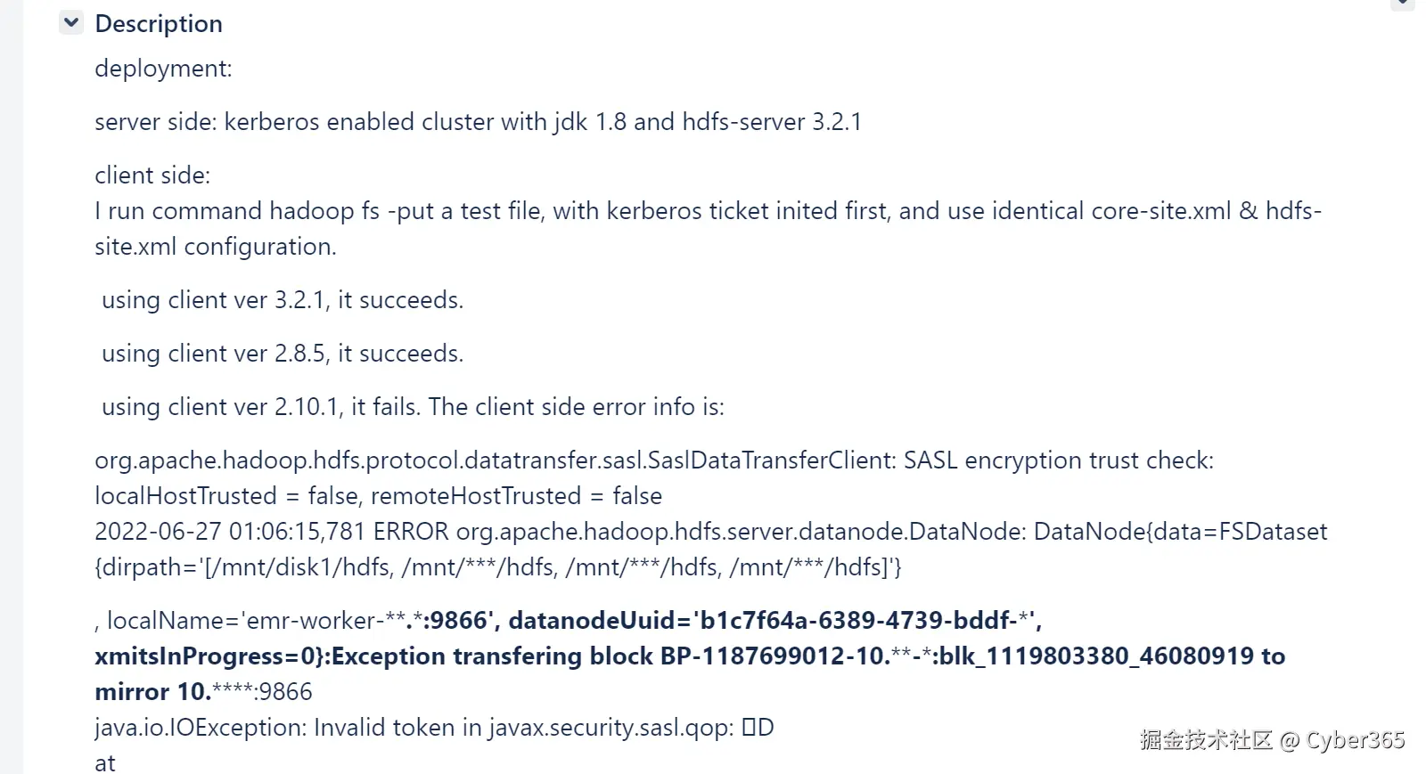 联系运维协助排查datanode节点直接是否存在故障,发现hadoop集群之间偶尔也出现上述异常日志,经过分析完善优化了一些配置,如:dfs.encrypt.data.transfer=true等配置未在发现hadoop集群出现异常;
