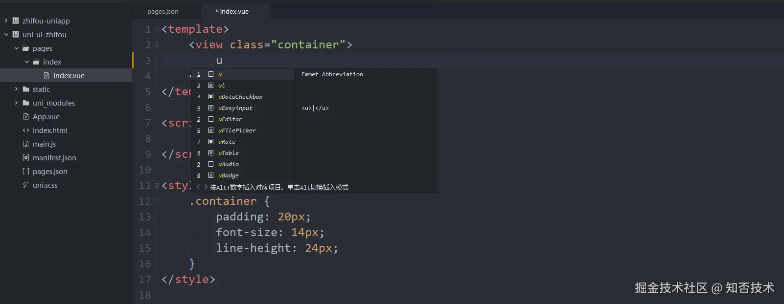 在代码区输入 u ,拉出各种内置或 uni-ui 的组件列表,选择其中一个,即可使用该组件。