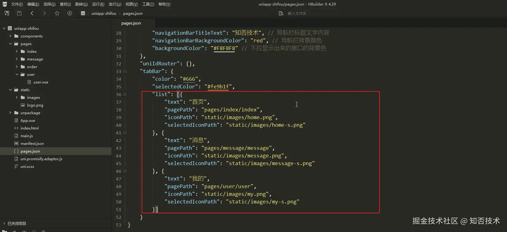 所有跟页面相关的配置都在 pages.json 这个文件里面。