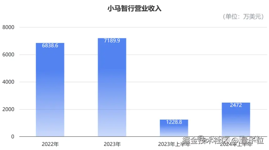 招股书显示,营业收入方面,2022、2023 年及 2024 年上半年,小马智行营业收入分别为 6839 万美元(约 4.9 亿元)、7190 万美元(约 5.1 亿元),以及 2472 万美元(约 1.8 亿元);其中,2024 年上半年的营收规模,相比去年同期增长 101.2%。