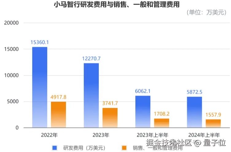 运营费用当中,研发费用为主要的运营支出。2022 年、2023 年以及 2024 年上半年,小马智行的研发费用分别为 15360 万美元(约 10.9 亿元)、12271 万美元(约 8.7 亿元),以及 5872.5 万美元(约 4.2 亿元)。