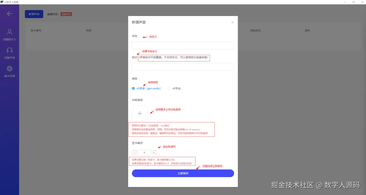 •版本选择v5普通模型无需训练,直接拍摄推理视频上传即可,效果因人而异。 •训练视频按要求上传,要求:尺寸1080*1920px,mp4格式,25帧率,视频越长占用内存越多,建议一分钟左右即可,推荐人脸居于屏幕1/3处,确保每一帧都有人脸具体打开 •显卡编号(如果设备只有一张显卡,显卡编号默认为0。如果设备有6张显卡,显卡编号从0-5,多张显卡会同时训练),完成之后点击保存即可