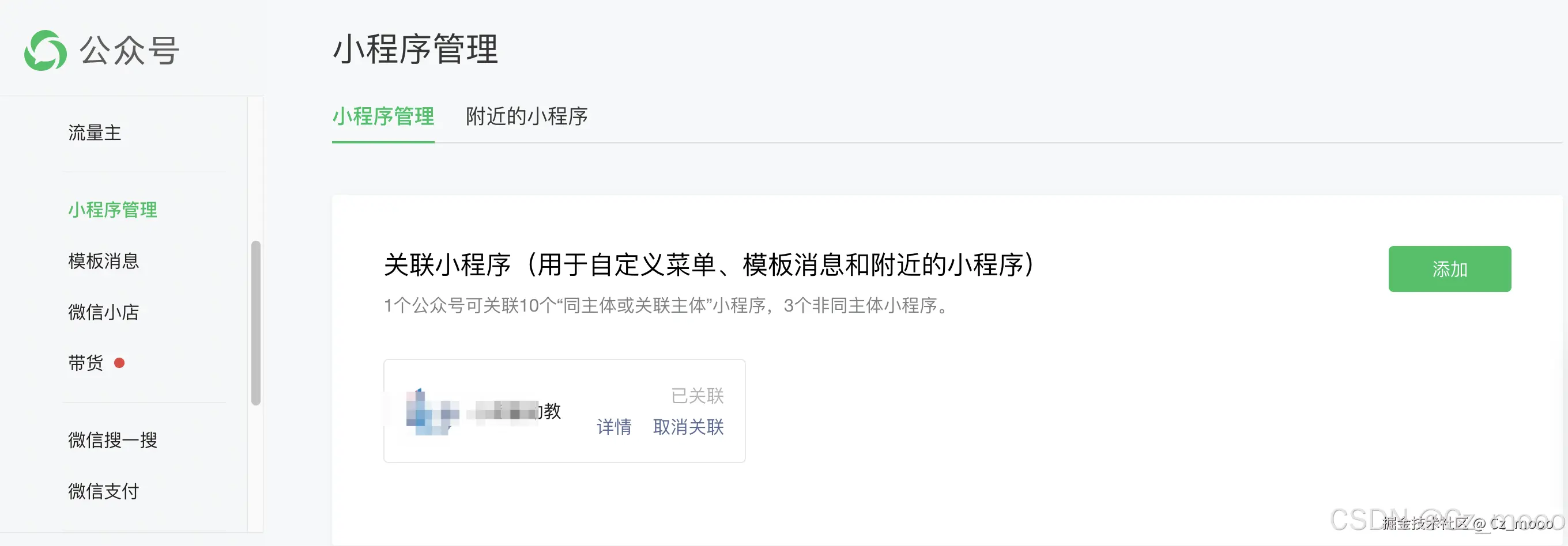 (2)公众号可关联10个同主体,3个非同主体小程序。同一个小程序一个月只能被关联 5 次。