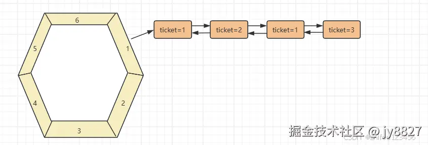 如图所示,就是一个时间轮,分成了6个刻度,假设每个刻度代表1秒,假设当前时间为0秒,则第一秒执行的任务放在刻度1,第2秒执行的任务放在刻度2。如果任务的执行时间超过了刻度6,比如第8秒需要执行的任务放在哪儿呢。我们可以将其对6求余,放在刻度2的位置,然后用ticket来表示还差几轮才会轮到自己执行。