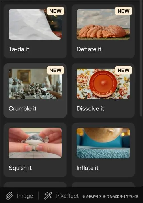 用户在使用这些特效时,只需上传一张图片,然后选择想要的特效,就可以轻松生成相应的动态视频。Pika的操作界面非常简洁,旁边的“Pikaeffect”按钮上还有一个魔法棒图标,方便用户选择想要的特效。