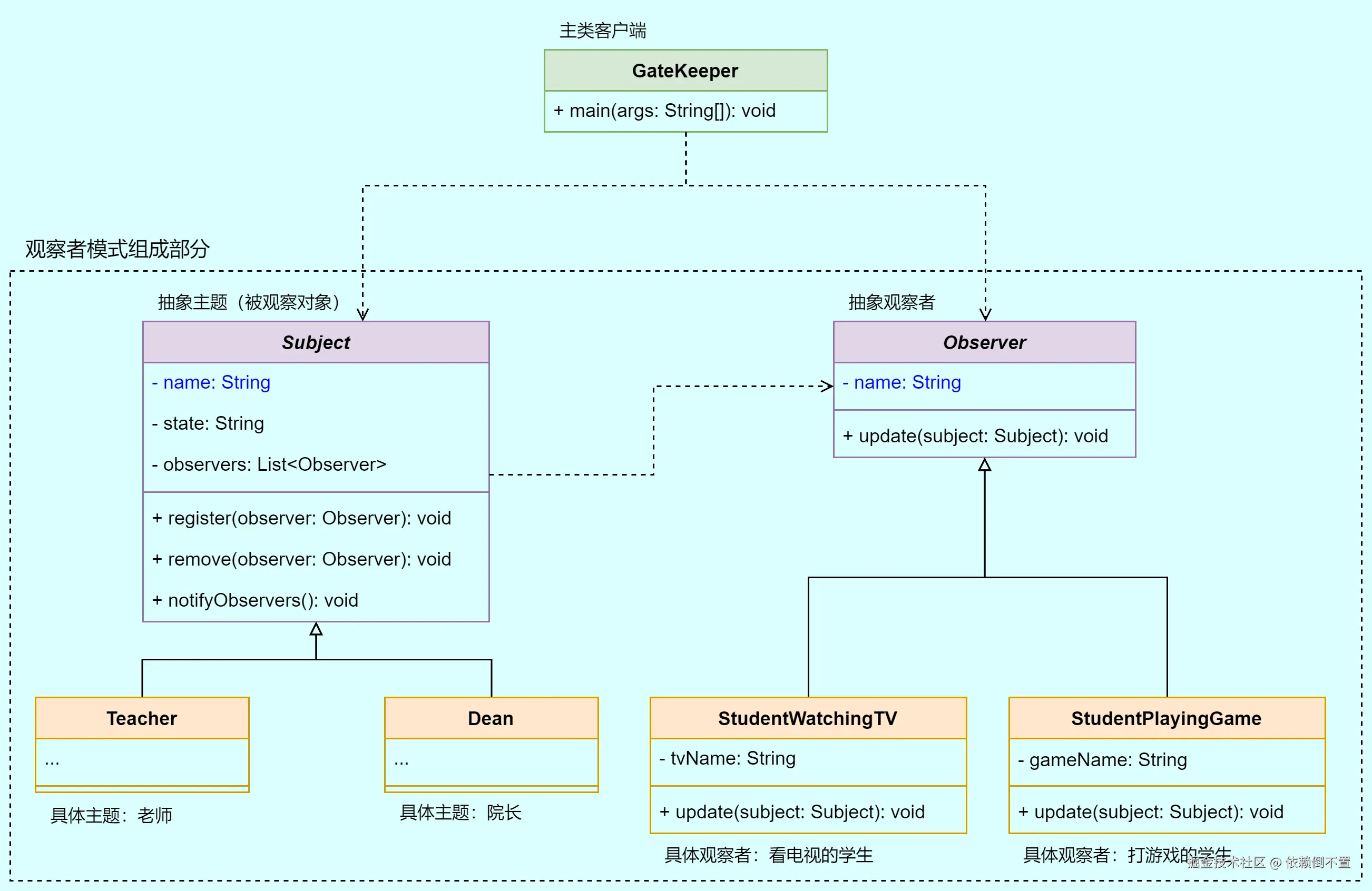 在上述背景故事场景中,被观察者都是老师(的行为),而观察者有几位学生(比如看电视剧的和打游戏的学生),他们观察到老师的行为发生改变(例如老师来了)后,就会立即停止摸鱼并切换回自己正在做正事(改变状态)。
