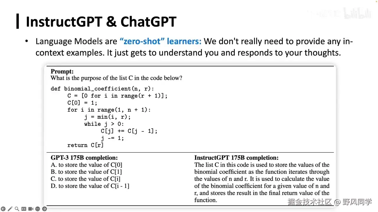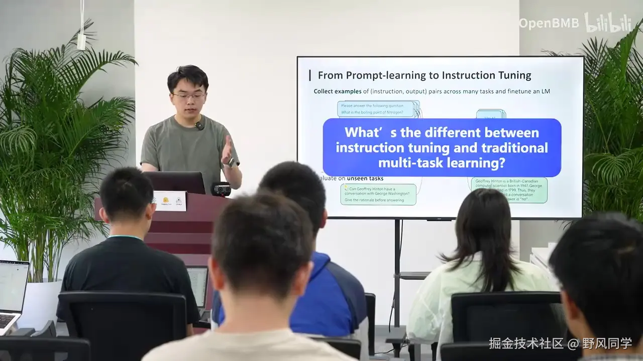 最后,我想强调的是,当前大语言模型的核心能力来源于指令微调带来的零样本泛化。通过指令微调,我们发现模型能够跨任务进行零样本泛化,即在没有学习过翻译的情况下也能进行翻译,这促成了我们现在所有的大语言模型。所有可见的语言模型都离不开这一关键技术。