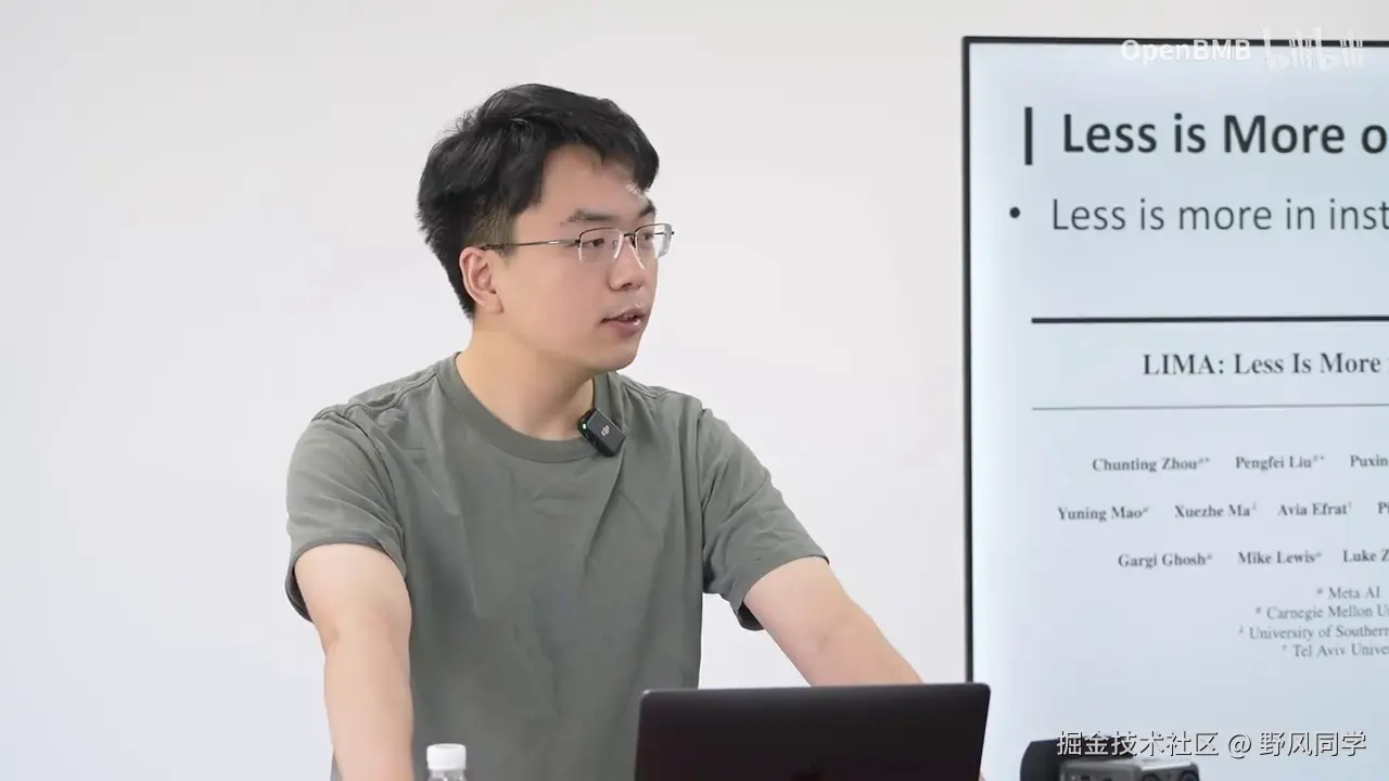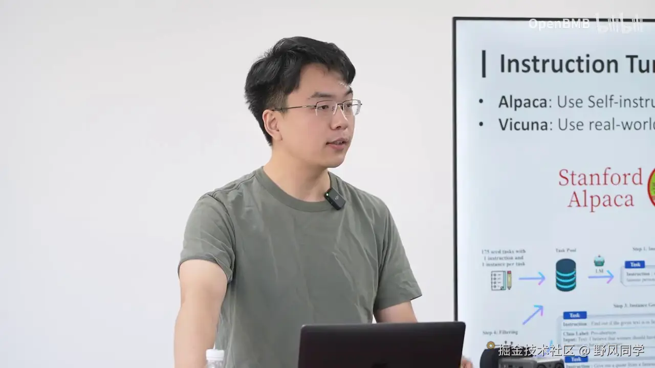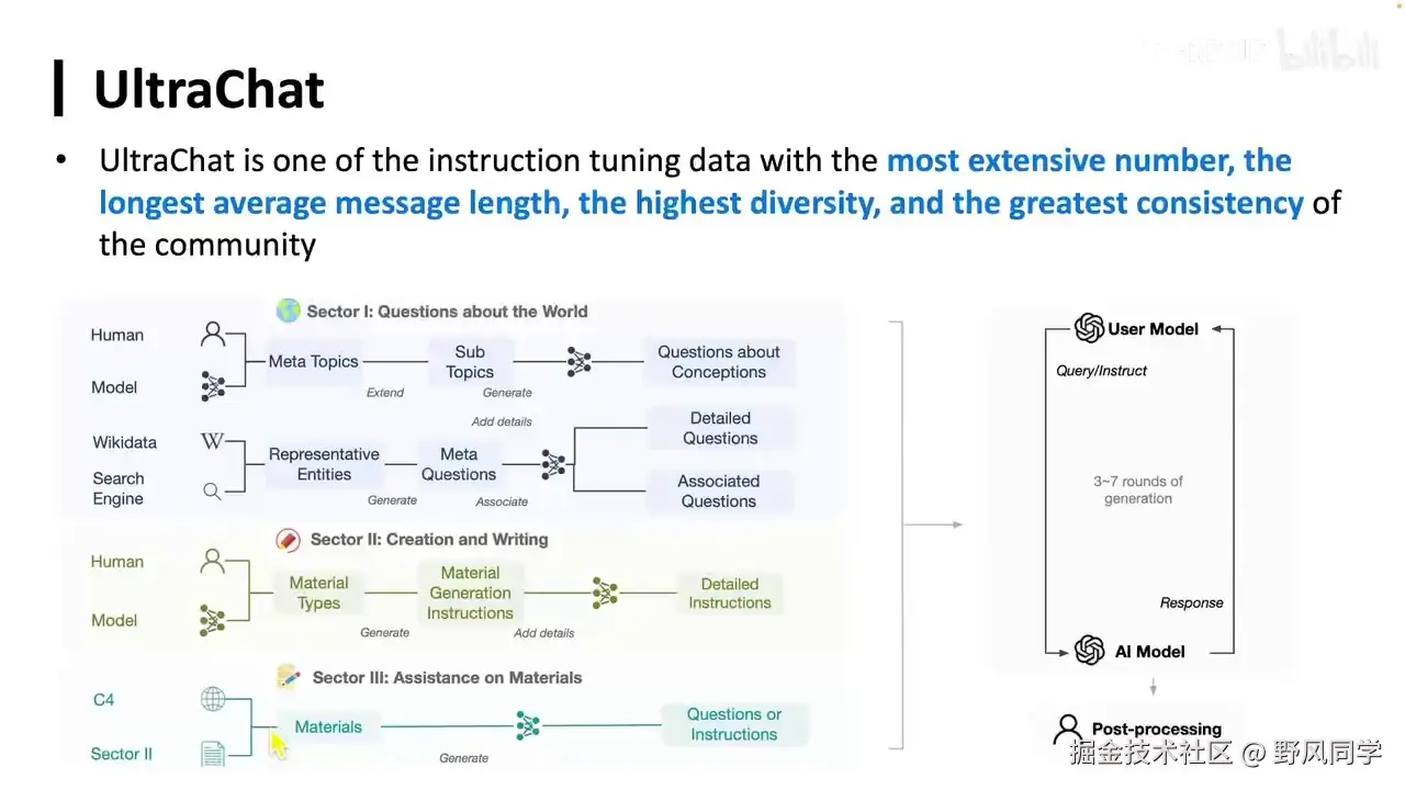 发现实现这样一个强大的工具,其门槛确实非常低。即使使用很少的数据,只需进行简单的微调,它就能具备多端对话的能力,也能执行不同的任务。然而,这一发现仅限于我们内部讨论,并未公开发布。斯坦福的Alpaca项目则采用了自指令方法,通过种子数据生成更多数据,并在这些数据上进行微调,从而开发出一个能够遵循人类指令并完成各种任务的模型。而Vicuna则更进一步,使用真实世界中人与ChatGPT对话的数据进行微调,这种方法被称为ShareGPT。结果显示,其效果与ChatGPT相当。因此,在指令微调层面,大家更多地转向了数据生成,因为方法本身并无太大差异,都是通过监督微调,给定输入并预测下一个Token的输出。此外,我们还开发了一个名为UltraChat的项目。在开发UltraChat时,我的思路非常明确,并非为了在特定任务上达到最佳效果,而是不再通过任务来构造数据,因为任务本质上就是一系列Token。