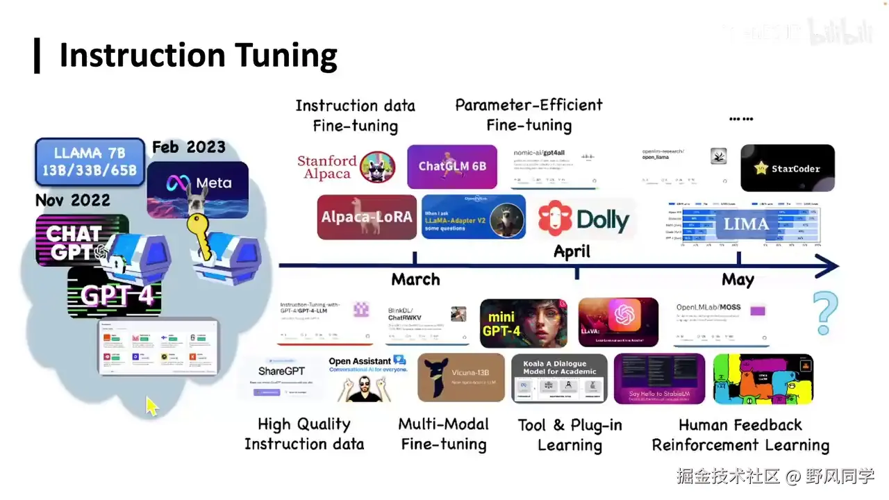 - 斯坦福Alpaca项目:采用自指令方法,通过种子数据生成更多数据进行微调,开发出遵循人类指令的模型。