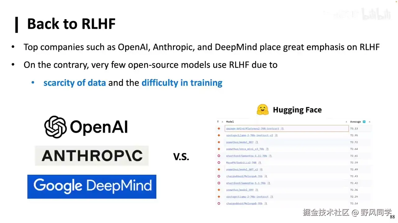 能力如此强大,正如我们前面所言,但其构建方式实际上相当简单。这些信息都是公开的,没有任何保密内容。例如,这一步是Instruction Tuning,下一步则是进行RLHF(Reinforcement Learning from Human Feedback)。然而,最近的研究表明,Reward Model,即评分模型,并非总是必需的。例如,我们可以通过数学推导,去除Reward Model,让模型自我评分,进而推导出新的公式。在这个公式中,前半部分代表获胜数据的奖励,后半部分则代表失败数据的奖励。通过优化这两者之间的差异,我们同样在进行RLHF的过程,此时这种方法被称为DPO(Direct Preference Optimization),它不需要Reward Model。